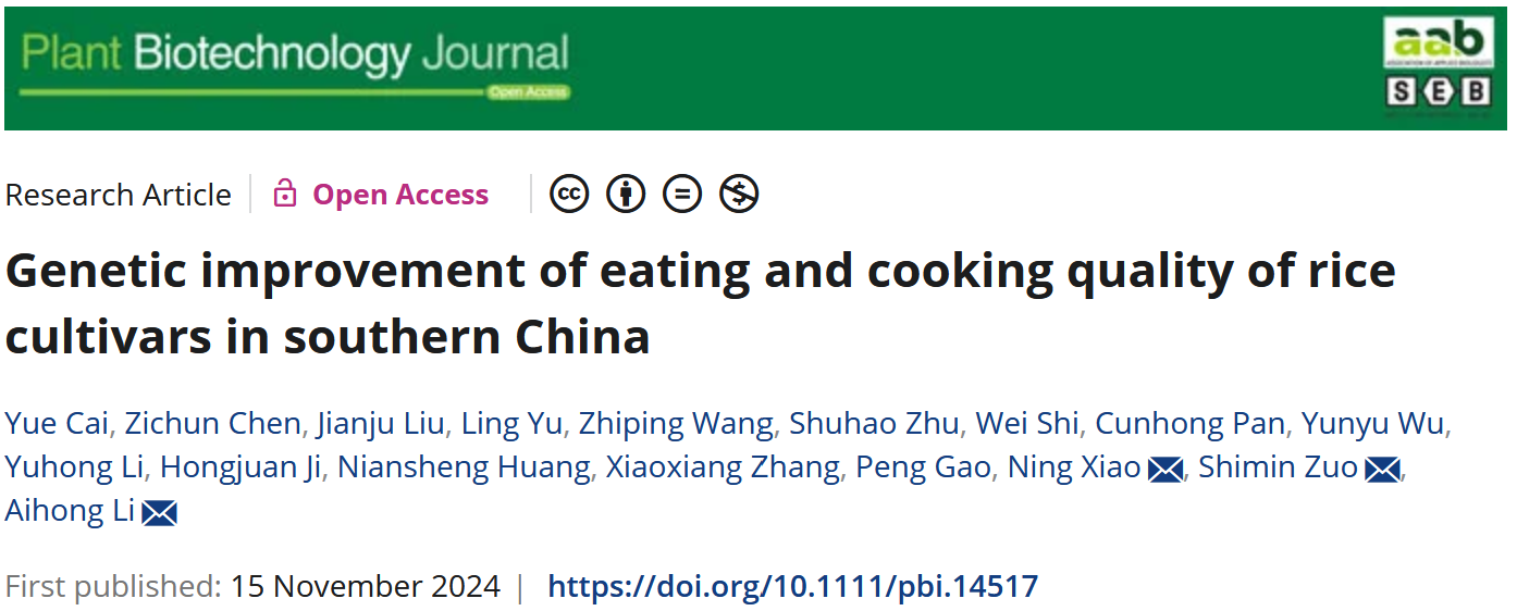 近日,江苏里下河地区农业科学研究所、江苏省生物育种钟山实验室李爱宏研究团队在权威杂志 Plant Biotechnology Journal在线发表了题为 “Genetic improvement of eating and cooking quality of rice cultivars in southern China” 的研究论文。该 研究从基因组层面揭示了 中国南方水稻品种蒸煮食味品质( ECQ) 改良的遗传基础, 并为育种家改进水稻 ECQ提供了新的遗传资源和育种策略。