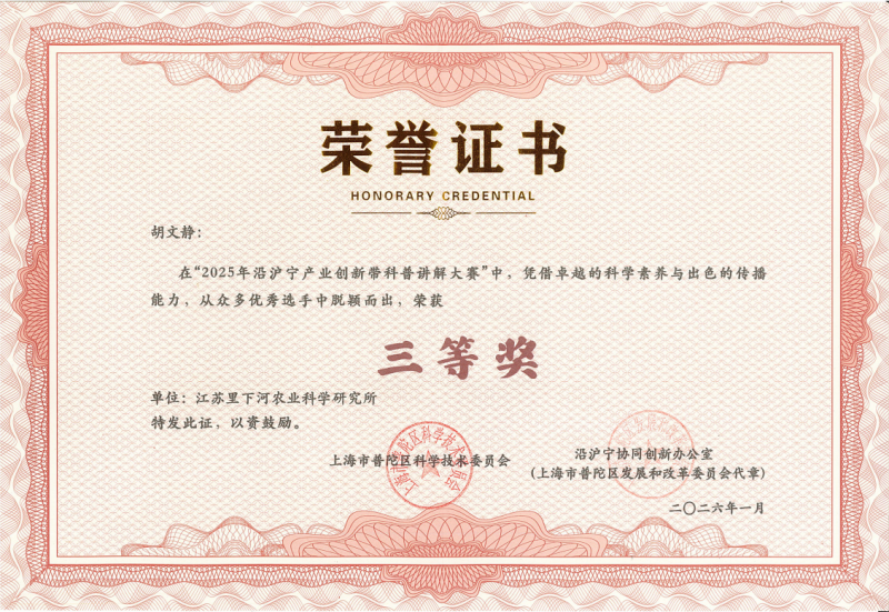 此次获奖,既是我所育种科普工作成效的一次生动展示,也为今后育种科普形式创新提供了有益借鉴。未来,我所将以此次大赛为契机,充分发挥获奖者的示范引领作用,持续加强科普人才队伍建设,创新科普服务形式,推动科学普及与科技创新深度融合,为沿沪宁产业创新带协同发展贡献智慧力量!